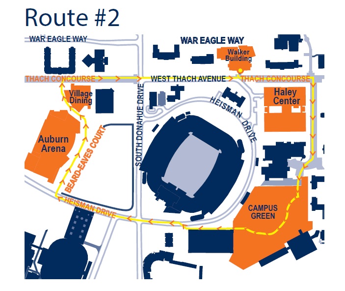 Turn north (right) onto Beard-Eaves Court in front of the Auburn Arena, west (left) around Village Dining Hall and north (right) to the Thach Concourse.
